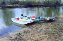 David's 14 ft boat with General Houston, the Pack mule boat, lashed alongside.