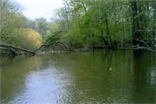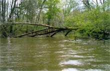 But early in the afternoon of the second day we came round a bend and there before us, from bank to bank, was a wall of pale fresh green. A recently fallen tree, judging from the fact that it was fully leafed out in spring foliage, lay across the river. We backed off, pulled out on the west bank, and surveyed the situation. Beyond the freshly fallen tree lay another, older fallen tree, and beyond it was what appeared to be more brush. The banks were steep and muddy, and the ground alongside the river was a swampy slough that would have made dragging the boat and our equipage up and over and around an extremely slippery affair. It was time to make a decision.