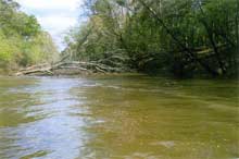 In 1691 the Spanish explorer Diego Teran de los Rios described the Neches as a small river “difficult if not impossible to navigate.” The Southwest Paddlers guide to the Neches says “The Neches has steep, muddy, heavily wooded banks that make egress difficult to impossible in many areas.” The guide goes on to say the Neches “is a very twisting river with many sharp turns, log jams, strainers and dead-end channels.” It is also a relatively narrow river. There are places where it widens out and places where it runs more or less straight. But for the most part it writhes, twists and turns, and is seldom more than forty or fifty feet wide bank to bank. Most of the countryside it runs through is dense forest. The image of Texas in much of the world is of the wide open plains, but East Texas is woods, and the banks of the river are thick with huge pines and oaks. When these trees are finally undercut by the river and fall they can easily reach all the way across, and running the Neches is essentially a struggle to get around, over or under these dead falls, snags and brush thickets.