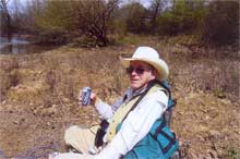 Ironically, the only time we lost any of our load was on the way back upriver. We came to a place where a big tree lay bank to bank, which on the way downstream we’d navigated through with some care. I saw a place where there were no big limbs hanging down, just a lot of thin branches, and I thought we could just power through, so I yelled for David to hold on to his hat and we ploughed into it. We got through with a lot of cracking and snapping, but a bag on top of the load was brushed into the river, along with the paddle David was using to try to fend off the larger branches. So we turned around, went back through, retrieved the paddle and the bag ( which contained David’s heavy jacket and his rain suit) which was floating merrily down the stream , then fought our way through the same spot one last time. We wound up with enough brush and sticks in the boat to have built a pretty good camp fire. One time going downriver I miscalculated an opening and ran General Houston square into a big ugly looking limb, thinking at the time it would surely either tear the pack boat away or smash the front of it. But with a great cracking crunch the end of the limb snapped off and a piece about two feet long fell into the boat.