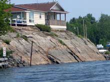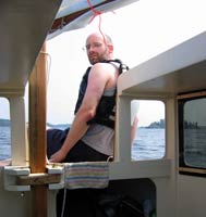 Andy had to tack back and forth to leave the channel. After one tack we smashed into this rock cliff. I was screaming "we're going to hit the rock" and he was screaming "no we're not". Then we hit the rock. |
