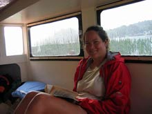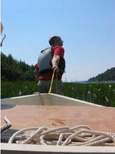 With everything looking up, it only took FOREVER to rig the boat and stow our camping gear. Finally at 2 pm we were ready to roll. The first 5 minutes after launching were packed with excitement. The launch was in a narrow channel and the wind gusty and contrary. Andy had to tack back and forth to leave the channel. After one tack we smashed into a rock cliff. I was screaming "we're going to hit the rock" and he was screaming "no we're not". Then we hit the rock. I don't remember exactly what happened next because I was crying and scared but eventually we ended up wedged in some reeds. Andy got out into the mush (yuk) and tried to walk the boat down the river. Eventually he decided to beach in the swamp and wait for the wind to die down. Adding to our humiliation several boats stopped to see if we needed help. Andy kept them at bay by smiling and waving as if to say “no we don’t need help, we really want to be stuck in these reeds within sight of the boat ramp“. So, there we were sitting in the boat: me crying and him all depressed. All in the first half hour.