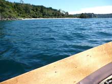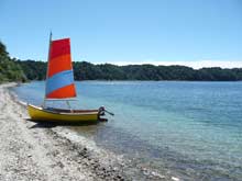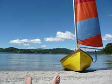 After a 2 or three of hours zig-zagging my way into the wind to the head of the North west arm, I “dead ran” downwind and found a sandy crescent beach with a couple of jetties and one moored boat. No one in sight, just the call of a few native birds in the trees, and the faint drone of a motor boat on the other side of the lake. The sand was fine and the wind temporarily gave out just as I landed. I lay on a towel for half an hour or so and soaked up the tranquillity. It had warmed up even more by this time, so I took a quick dip in the surprisingly warm (this was supposed to be early Autumn) crystal clear water, before the thermos and snacks were broken into.