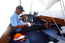 We sailed in all kinds of weather. (Here is where attitude pops in. We were open and prepared for most anything so when we got everything it was all just part of a great trip.) We experienced hot days with little or no wind, days with strong winds and thunderstorms and chop and one day with clear skies, good wind and swells all going in the right direction. No problem for this boat. With the exception of the rain the boat was dry as the bow forced all the swell splashes off to the side and away from the boat. I never felt we were in danger or that the boat couldn't handle the situation. One really neat feature was how the mizzen would keep us pointed into the wind when we needed to adjust the main or handle some other situation. I always felt we were in control. That was my next surprise; the Pathfinder could really handle anything the weather had to offer. We just enjoyed the ride.