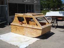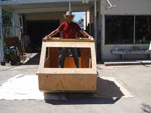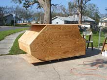 I guess the picture shows I was wrong on both points. He showed up the following weekend with a couple pieces of paper and a truckload of plywood. Although I ended up editing a lot of the design to allow it to be converted into an actual floating vessel, he did have enough done that I conceded that it could work. It was at that point I knew I had really screwed up because he started unloading plywood from his truck! I had already agreed so kept my mouth shut and helped him upload the wood. We began laying out the design and had the basic boat cut out in a matter of ½ a day. Stitch & gluing (actually screw & gluing) the sides, bow & stern allowed us to see the basic outline of the boat. We then glued the flat part of the bottom to the boat so we could sit it on rollers. I can tell you we got our share of stares from the folks driving by trying to figure out just what the heck it was! We’re pretty used to being stared at so it didn’t bother us much.
