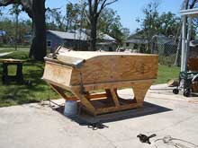 Tim decided to make a patriotic statement and painted her red, white & blue. At that point we were ready to take her to sea! A quick installation of a 5hp outboard and off we went. The 5hp wasn’t nearly enough to get her up on a plane and I wasn’t sure I wanted to go fast in her anyway. She’d only do 5mph but she’d do it at an idle as well as wide open, so we idled her down and cruised around the bayou. We’d have to stop about every five minutes to show her off to everyone that waved us down. We’d slow her down to a crawl and push the tiller over so she’d spin like a top. This made Tim dizzy and he got a little flustered with all the attention. He said that we’d take three days just to get out of sight from the dock with all the attention she drew.