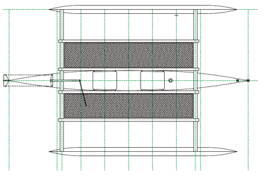 In the interim, I had these extra trimaran iakos, tramps, and so forth. I contacted Chris Ostlind for a custom design that would add true trimaran performance while making use of my (for me) big investment in a nice custom sail and trampolines. He designed the Cardiff 21 that appeared in SCA a couple of issues ago and looks like this.