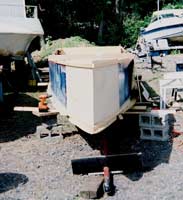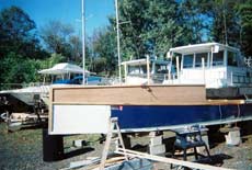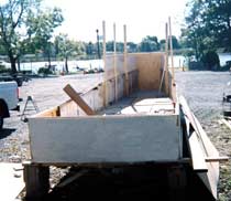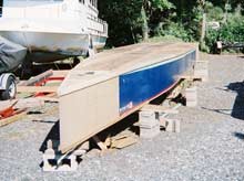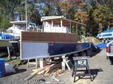 Next came the need to rebuild the stern area lost in the surgery of "Katie". I installed a 3 foot section aft and put on a transom made up of 3 layers of 3/4 inch ply. I put an athwartships piece of 3/8 inch ply to match the other bottom section.