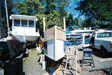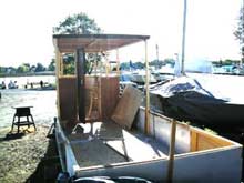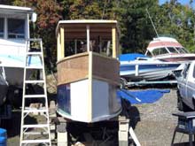The next step was to turn her over and begin on the superstructure. Using the model I layed out the cabin dimensions. After I increased the hulI sides forward I installed the uprights, which will become the windshield, side windows and supports for the roof. I installed the forward bulkhead which forms the flotation chamber in the bow. I made it such that there is a Bolger anchor well in the bow, self draining. I framed in the deck between the anchor well and the windshield to accommodate a hatch. In the boatyard where I keep her are abandoned boats. The marina owner said I could take any items off a boat he was cutting up. I got a nice 2 foot square hatch and 2 smaller opening ports that I will use on the hull sides forward of the windshield.