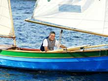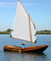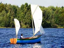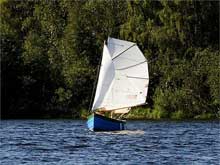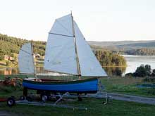 And when that problem was OK and I could begin to sail her I noticed that when sailing with the wind from the side she wanted to turn downwind, one reason for that may be that the centre of the sailarea is too far ahead. And another reason could be that she has a flat bottom and is quite light, so the draught with ony me aboard is maybe only three inches, and less then that in the front part. And I had added a skeg only in the aft part, which could be another reason. So this coming summer I will try again with a forward skeg added, a jib that is reduced from 3sqm to 2,5sqm and a batwing mizzen sail that is increased from 2.5sqm to 3.3sqm.