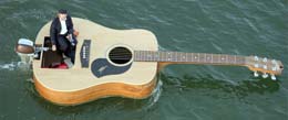 Came across this on the web – thought it was interesting. “Singer-songwriter Josh Pyke rode this rather nifty guitar-boat into Australia's Sydney Harbor as part of a shoot for an upcoming music video. The giant-sized floating six-string is a replica of the musician's instrument of choice - a Maton brand acoustic.”