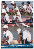 Then, as I had the scanner out and was in the mood, I hunted up some dragon boat photos I took in Cambodia later that year (what made me think of them were a couple of posts talking about dragon boats on the Yahoo forum). They were taken in late November during the Water Festival on the Tonle Sap river in Phnom Penh. The river is fed by a large lake about 75 miles north of Phnom Penh, and actually flows uphill for a large chunk of the year. During the wet season, the Mekong River rises, and as there is only (as I remember) 10 feet or so of difference in elevation between the lake and Phnom Penh, as the Mekong rises, it forces water back up the channel and the Tonle Sap lake grows by about 6 times, flooding about 1/4 of the country. Then as the Mekong falls in the spring, the water reverses. The Water Festival marks the day, more or less, when the river's flow turns back into the Mekong and the sea. This is important for Cambodia, because the fish from the lake are trapped and netted at this time, providing most of the country's protein for the year. They take many of the fish, gut and scale them, then grind them up and pack them in big (6'x6'x4') woven bamboo baskets and let them ferment. The fish "cheese" is then packed in jars with lots of salt and can keep for years and is mostly used to flavor soups and sauces. In small quantities, as a seasoning, it is really good, but I remember riding north out of the city sometimes in the cheese season, and man, the smell, even in the open air, could fell a water buffalo.