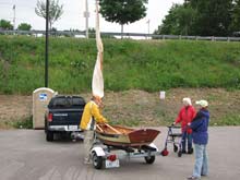 A few days ago and almost two years to the month of ordering plans from Steve Redmond, of Redmond Designs in VT, for his 9’8” TETRA sailing skiff, BROUHAHA, treated to a splash of wine from my 86 year old mother, rolled down the ramp and into water to ride easily on her lines on a blustery and rainy late spring day.