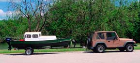 Here are a couple of pictures of what I built (no, not the jeep, that's there for scale) with all the stuff I ordered from you. I ended up building my own design, but the JM plans were very helpful in the design and building process. Been on the water 3 times so far and I'm very happy with the results.