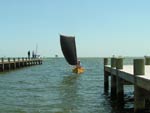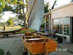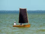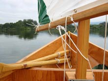 I attached a couple pictures of the recent splash (Saturday May 31st) of the sharpie we just built. I also attached a picture the day before when we hung the newly constructed sail. The boat was great structurally but sail performance was disappointing. The winds were 10 to 15 and closer to 15 on Saturday so we had a really good sea trial day. As you see she doesn’t heel much with 2 adults as ballast and we weren’t hiked out over the side either. We will be cutting the sail shape a little differently this week to improve sail performance. The oarlocks are a little too low and we will need to add a pad to gain 2 or 3 inches of height. The seat was actually the part that was too high as opposed to the oarlocks, but it’s a lot easier to adjust the oarlocks than the seat top.