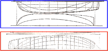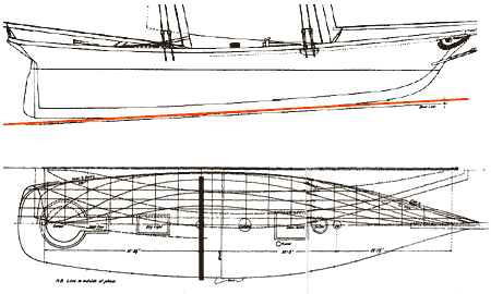 The lines within the red box are from Flying Fish, named after designer Bob Fish, around 1850. While the deck lines are similar the lowest waterline shows how sharp Flying Fish was.