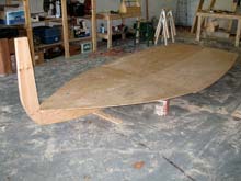 My garage has become an impromptu boatyard where the keel and bottom boards of a Stevenson Pocket Cruiser are in place. |