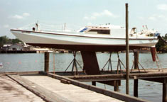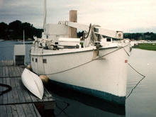 Resolution at the Montgomery yard around 1992; beside it is Kotick, the Bolger's kayak built for him by Dynamite Payson. |
