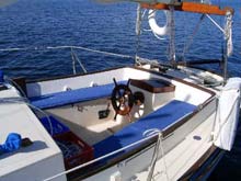 Cockpit of Lazy Jack with fine oak and mahogany woodwork done by Mike. |