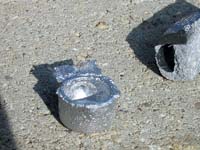 Here’s the spongy, oxidized stuff I took off the top. You don’t want to put this on concrete, because the water in it can cause explosions. This is asphalt, so it just melts and burns. I should have had my ingot mold handy.