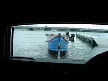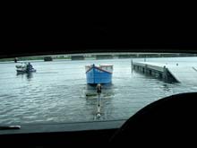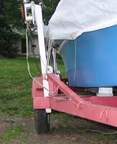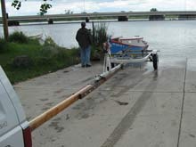Retrieval is not quite so tidy as launching. I had to get my feet wet walking on the trailer frame to guide the boat onto its bunks. This would have been easier with goalpost-type loading guides, but I still would have gotten wet to crank the winch. But I guess getting wet once is better than twice. I think if my bow eye had been at the right height I could probably pull the boat into a set of goalposts and cleat it to the tongue extension, then winch and shove it into place after pulling out of the water. But this is a guess, and it probably would have required rollers to work.