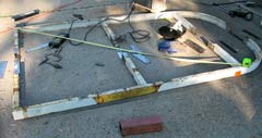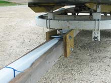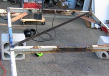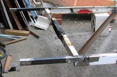 We should add something to support the motor’s weight. You could view this part of the trailer in two ways. On one hand it will take quite a beating, with the motor’s weight hammering on it whenever you tow it. On the other hand, anything is better than nothing, which is what has been supporting the stern. I thought about simply extending wooden bunks, but I wanted to use 2x4s on the flat, so they would probably be too flexible. So I welded something together out of more of that bedframe angle.