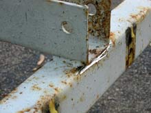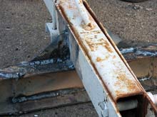 They probably should have done it this way from the beginning. They probably should have used some other gussets too. This frame has always twisted very noticeably. Here are two images with my dad putting the weight of one leg on one side of the rear of the frame, then the other.