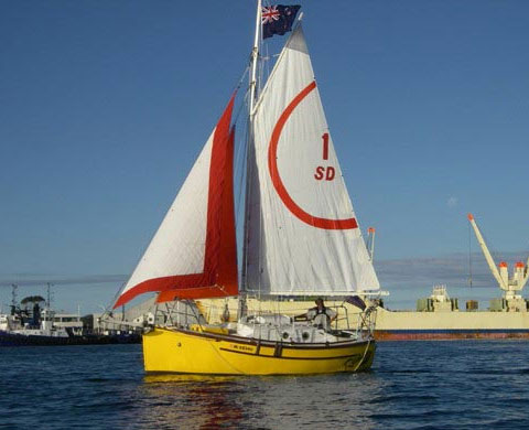 John Welsford of New Zealand, well known to Duckworks readers had designed the 6.5m boat and Whipple, an American of Arizona had spent two and a half years building Resolution on Wellsford’s land in the Waikato region while dreaming of sailing the really pretty little gaff-rigged yacht single-handedly around the world. He had set out in most atrocious weather bound for Honolulu and heading up the Northland coast had discovered a fuel leak so was returning to Tauranga where the boat had been launched. Rescued off the slippery rocks by Westpac helicopter Whipple was saved but the yacht was destroyed, and John Welsford has told me that Charlie has a 32’ boat sitting in a Mexeco marina which he plans to overhaul, then sail it back to Japan, then around the globe and back to Japan.