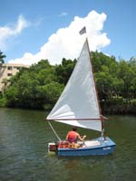 A Footy with audacity. An unusual impromptu contest (above) with a Bantam Boats Footy out to prove superiority over a pair of kayakers. I don’t know who took what is an excellent photo and I can’t tell you whether the tiny sailboat was successful, but hopefully some will enjoy the `all action’ photograph.
