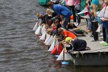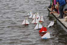 One for the READY and two for the GO! Andre Ros of The Hague Model Boat Club in the Netherlands captured this fleet of ten wee yachts (above), a mixture of gaff and Bermudan rigged, preparing to start and then actually on the go. These are Klompen, the wooden shoes that farmers and fishermen used to walk on that were used by kids to make model sailing ships. They have a false keel but no radio control and the photos were taken at Gaastmeer where they are raced with much enthusiasm. The third photograph is of Hans Staal’s klomp that he used to use when he was a little boy which doesn’t have a false keel.