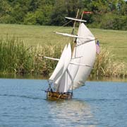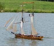 Finally, this magnificent 1812 style American Privateer schooner is the work of Robert Franklin (alias Captain Crash!)) of the Montgomery Model Boat Club in Montgomery, Alabama, USA. This informally structured club, founded in 2007 mainly sail Nirvana sailboats which cost under US$200 and they have 17 such boats in the fleet. Members also sail a variety of other boats, both power and sail. Their comprehensive website is worth a visit, go to montgomerymodelboatclub@yahoo.co