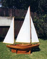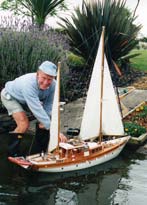 In 2003 (which using my fingers I reckon… is let me see, six years ago), a fellow Auckland, New Zealand Ancient Mariner model yacht sailor and friend of mine, `Big John’ Stubbs built the beautiful ketch (seen below) which he named Jaunty. I’m no good at all this `twice and thrice removed’ stuff, (if it’s been removed it’s gone, sunk or been ruddy stolen) and this boat, its design by yacht designer David Train, is still very much alive and well cos I saw it only day before yesterday!)