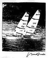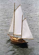Built plank on frame from a plan he found in a book the timber used for planking was kauri, used also for masts and spars, all trim in teak. The boat fits into his car fully rigged and the boat has two keels, one 3lbs for light weather sailing the other 5.5 lbs for heavier weather. That then is a capsule look at Jaunty, indeed a rather sharp looking sharpie.