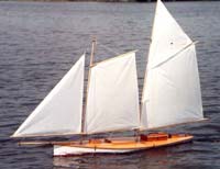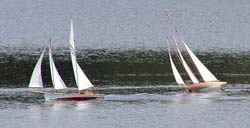 The other sharpie I choose to write about is a model in Maryland, USA, this one a schooner built, tried, tested and successfully raced at races staged by the Great Schooner Model Society and the US Vintage Model Yacht Group by George Surgent of Seaworthy Small Ships. His schooner (seen below) is called Bay Boy and was inspired by an article in WoodenBoat magazine some years back on the Carolina sharpie schooners of old. A long time sharpie fan he built the model in 1998. It has sleek lines, is low to the water and always proves when sailed in competition how damn fast she/he (well sometimes, these days you can’t tell!) it really is. Bay Boy has had some truly memorable close battles with South Carolina’s Andrew Charters larger schooner of Fife design, Cicely, one of those tussles captured below.