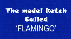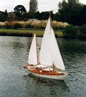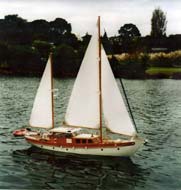 Roy Lake became so enamoured over the ketch when he saw her in 1991, he went aboard when the boat was on the hard, took several rolls of photographs to help him with details and measured virtually everything that could be measured. After 1,700 hours of work over eleven months, his model of the boat which he called Flamingo was a reality. The model was built around a solid timber core of building pine and is radio controlled on all sails, her masts are planed kauri timber and booms also of kauri, and is fitted with a 6volt electric motor with 6 to 1 speed reduction.