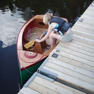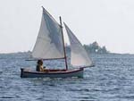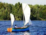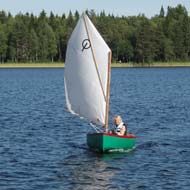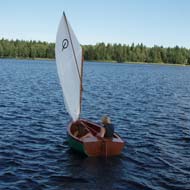 I decided to build the 8´2” version in strip-planking , and in the beginning of May I got a job very close to my boathouse, so I could work there between twenty and thirty minutes every lunch, and it took me two months to finish the boat. And then my daughter started to test it. At the first launching it leaked a little, but I could fix that by filling the lower part of the centreboard case with epoxy. And then it worked well, as you can see on the pictures.