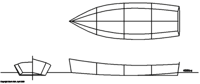 12ft length overall by 4ft beam, by 400lbs displacement, designed for stitch and glue construction using 1/4in or 3/8in 4ft by 8ft plywood