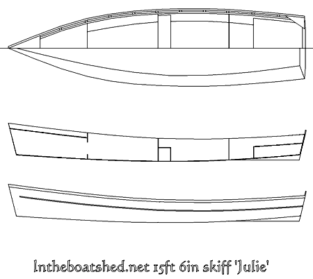 The Julie skiff as laid out in these plans is a lightweight stitch and glue flattie skiff that would be a nice rower for one and can carry two at a pinch. The name came from my partner, who took rather a shine to the boat.