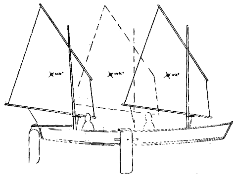 No real change here from the original cartoon but I've shown the single mast setup in dashed lines. The tiller of such a boat always bothered me. The masts are on centerline. The tiller has to end short of the mast of course to allow it to swing. So the skipper has to hand it back and forth to himself sometimes on tacks. I think what I show is the best approach, or at least the simplest. Any other rig would require some linkage or perhaps a large oddball tiller. This should work OK given the long stretches with no tacks required in the race.