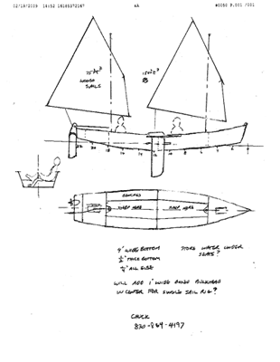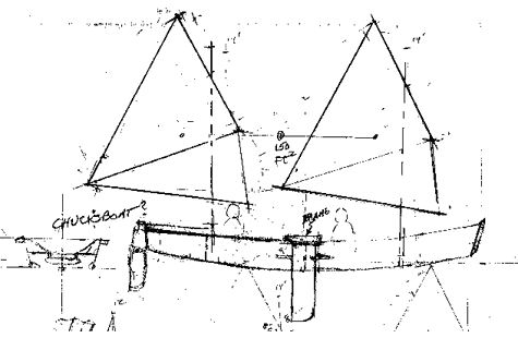 The two sails and masts are the same as my Ladybug rig, something CL already has on hand, at least one of them anyway. Then there is a plan to have the ability to mount a solo mast in the boat's center.