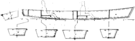 At first I gave it long bench seats like Mayfly16's but on second thought I changed to individual seats that cross the backs of the cockpits. On a trip this long you must be comfortable. These should be quickly removable to allow clearing for the sleeping spot. The bench seats simply can't allow a center aisle wide enough for sleeping. I might add that if the boat were used on occasion to take out a very numerous crew, say a family reunion, then I would suggest leaving the seats on shore and have all sit on the floor. Then again, if you are never to sleep in the boat you might install the bench seats, which can be somewhat complicated but usually provide the best comfort. Anyway, the side view cross section ended up looking like this: