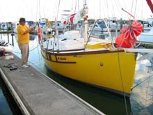 She proved to be faster than expected, not spectacular you understand, but she feels very good to sail, tacks and steers very positively, points well and is very well balanced requiring little effort to keep her on course. We did not expect to keep with the local coastal racers but over a few hours she was often still with the lighter and faster boats. Her motion though was much more comfortable than those lightweights, and the first real sail outside the harbour showed this up very well.