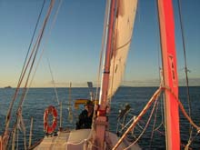 Our little cutter proved to be a very capable sea boat, easy to handle, not at all sensitive to trim or conditions, easy to work, faster than most would expect and very capable of making long voyages in reasonable comfort. We took turns on watch in the deep and comfortable cockpit, did a couple of changes of sail finding that the combination of wide side decks and cutter rig made for an easily worked rig, off watch we slept surprisingly comfortably in the big bunks down below considering the horrific conditions, and although it was not the sort of weather I’d choose to go out in, it was a very good experience to look back on. We had a good time and the while the little boats first sunset was a very black and threatening one her first dawn at sea was just beautiful.