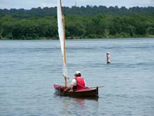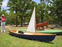 A variety of small boats and their handlers attended the 2008 messabout.  Local boatbuilder and designer David Nichols and his son came with one of his Indian Girl canoes, complete with downwind sail.  Unfortunately there was no wind, but it is still a fine craft!