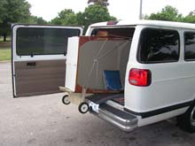 Roger shortened this boat to 12’ so it fits into the back of his long van, eliminating the need for a trailer. (Once it is all in, the rear door does close.)  Once it is out, he sleeps in the van.