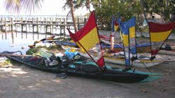 A Kruger Cruiser in the foreground (carrying NiteNavigator and Nitesong) and a Kruger Seawind (with Whitecaps) behind it. On the other side of the sign is Wizard's 12-foot kayak. |
