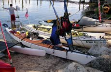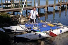 Crazy Russian starts to disassemble his inflatable catamaran at the finish line in Key Largo. |