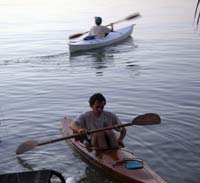 Matt Layden (Wizard) paddles one of his older kayak designs while his wife Karen paddles his EC boat at the finish line in Key Largo. |