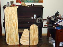I built her over a 7 or 8 month period starting the end of 2007. As I have to build outdoors and without permanent shelter, I began by making the bulkheads, leeboard, rudder and stock, and oars while waiting for weather warm enough to cure epoxy to move outdoors.