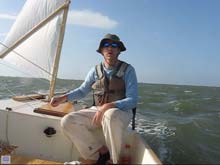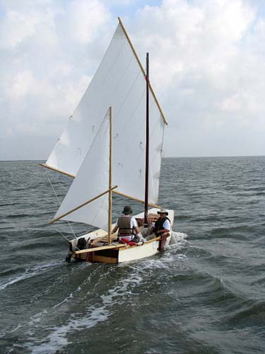 The design, a prototype, was drawn up by Jim Michalak upon request of Mike ________ for an enlarged Pickup Pram, one of Jim’s first designs, well proven for years. Hence the name Mikesboat. I chose this design over Family Skiff because it could sleep 3 with a minor modification and I hoped to get both Paul and younger son Sean, to go along. Paul did so, but Sean went to China and India on a college trip instead. As much fun as we had sailing, Sean probably had the better trip!